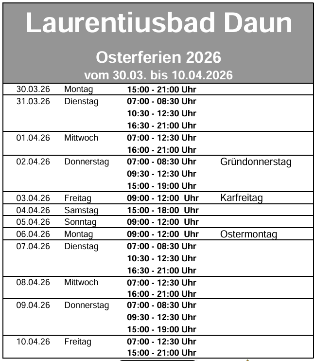 An folgenden Tagen sind wir leider nicht für Sie da und das Bad ist geschlossen: